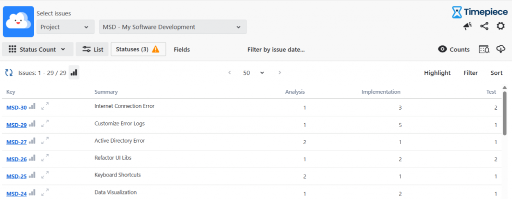 For a ready-to-go solution, you can use an Atlassian Marketplace app that will give you such reports instantly. One of those apps is Timepiece – Time in Status for Jira. Timepiece is the oldest and most capable Time in Status app in the Atlassian Marketplace.