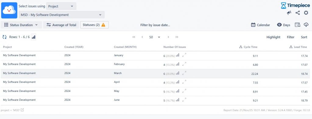 • Status Duration Report: This lists each issue and shows exactly how much time it spent in each specific workflow status, making it easy to identify bottlenecks.