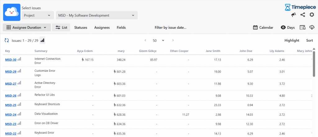 Another useful report type in this regard is Assignee Duration. This report type works similarly to Status Duration, but instead of status times, it shows assignee times. In other words, it shows how much time each issue spent on each assignee.