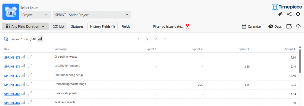 To generate a comprehensive sprint report that goes beyond a standard velocity chart, use the Any Field Duration report in Timepiece. By selecting “Sprint” and “Status” as your history fields, you can see exactly how much time an issue spent in every status under each individual sprint. This advanced report helps you track “Sprint Jumpers” (issues that roll over across multiple sprints) to spot poor estimation. You can also group these reports by Story Points to analyze if your team is getting faster at delivering complex tasks.