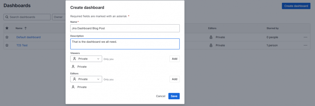 First, ensure the Timepiece – Time in Status for Jira app is installed on your Jira instance. Once the app is ready, navigate to the dashboards section by selecting Dashboards from your Jira navigation bar. From there, select Create dashboard and provide a descriptive name and a clear description so your team understands its purpose.