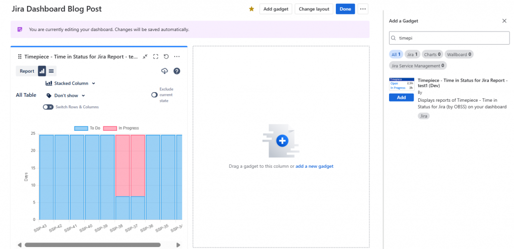 On your newly created dashboard, look for the “Add gadget” button and click it. A pop-up window will appear with a list of available gadgets. Use the search bar in the pop-up to find the “Timepiece” gadget and select it from the list.